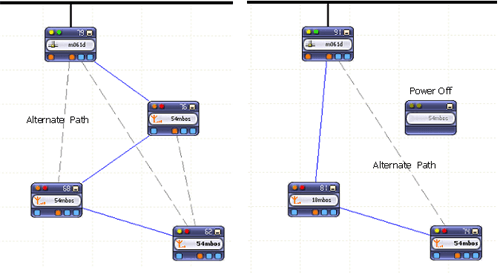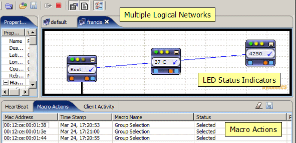 MD4000 mesh network. Based on Java technology, the NMS runs on any PC with the Java runtime environment. MD4000 nodes appear as graphical widgets with multiple LED status indicators, allowing point-and-click management of the units. The status window on the bottom window reports the current state of all nodes based on their recently received heartbeat. Heartbeat data includes transmit rate, signal strength, board temperature, packets moved etc. The left hand side properties window provides detailed information for a selected node including AP client activity.
